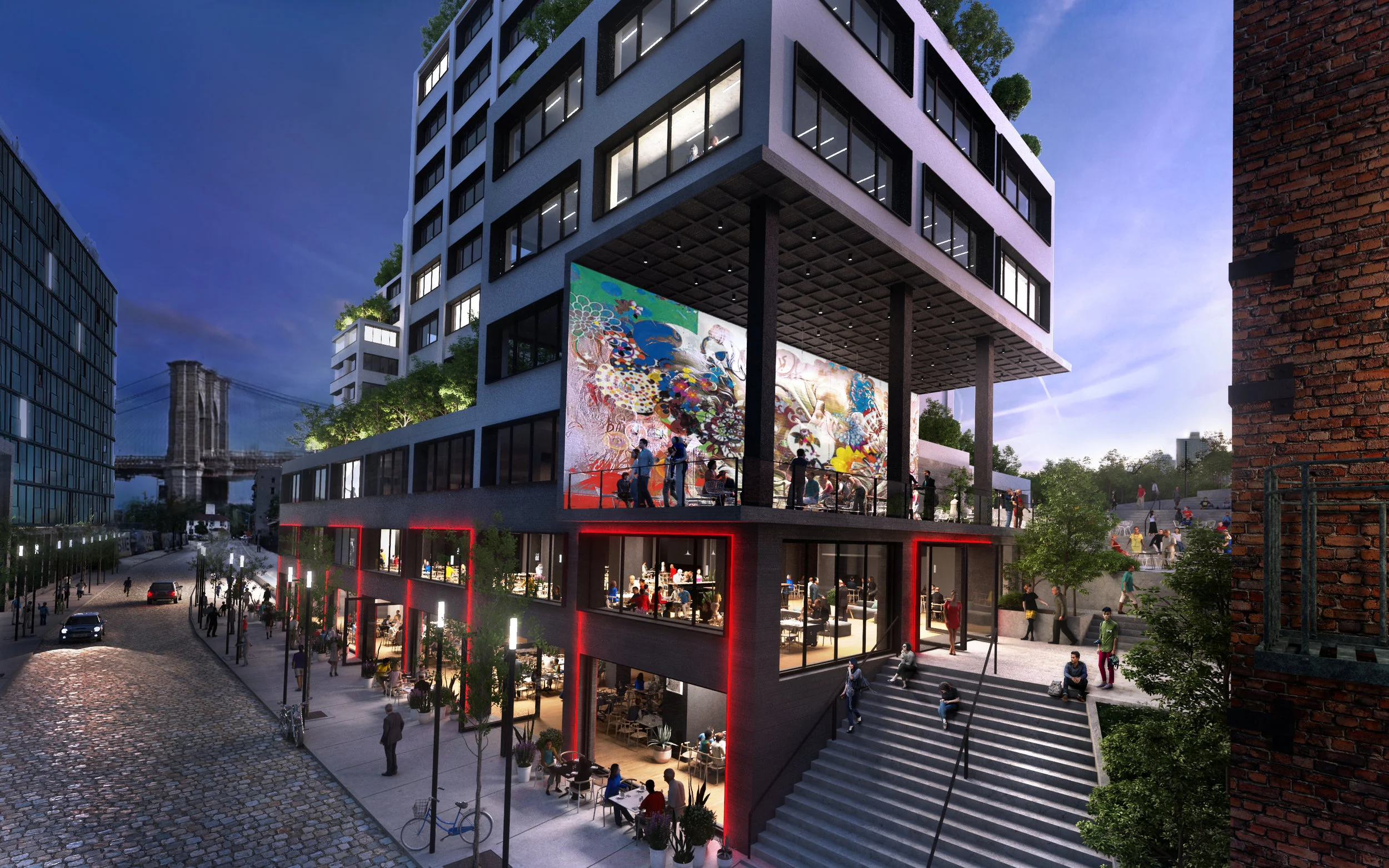 The expansive Watchtower campus in Brooklyn’s Dumbo neighborhood offered a chance to create a vibrant street life to an area that had been self-contained for decades. After its sale to a private interest, it was time to let the people in. The office space itself already had good bones — large floor plates, windows with views and natural light — but the buildings below needed a new life. Add a dynamic, connective retailscape to make it irresistible. Give the tenants what they want and the neighborhood what it needs, and watch what happens!