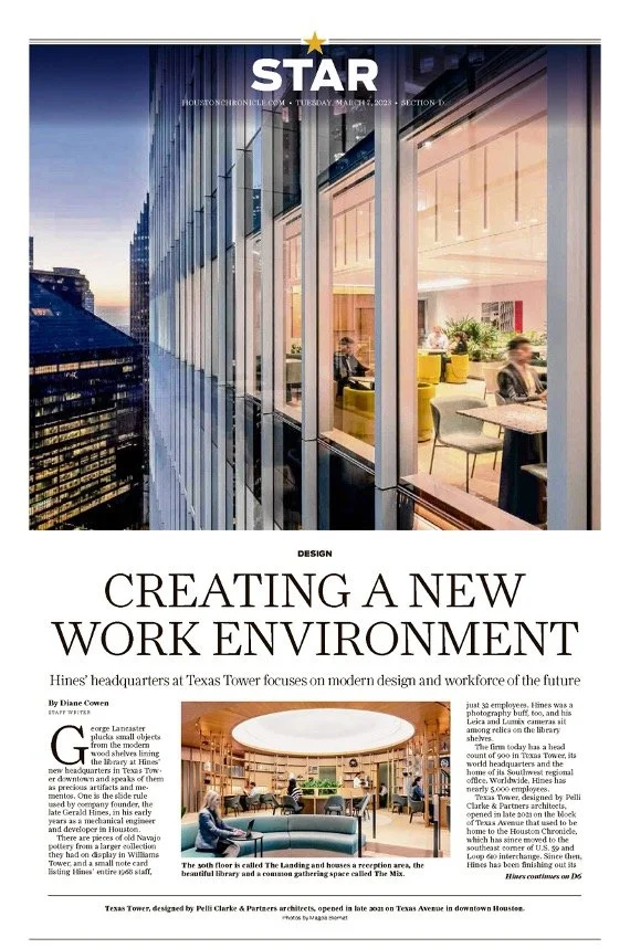 Texas Tower, designed by Pelli Clarke & Partners architects, opened in late 2021 on the block of Texas Avenue that used to be home to the Houston Chronicle, which has since moved to the southeast corner of U.S. 59 and Loop 610 interchange. Since then, Hines has been finishing out its own office space on six floors of the high-rise — floors 30 through 35, all with spectacular views of downtown and beyond — with modern furnishings and high-tech workspaces.