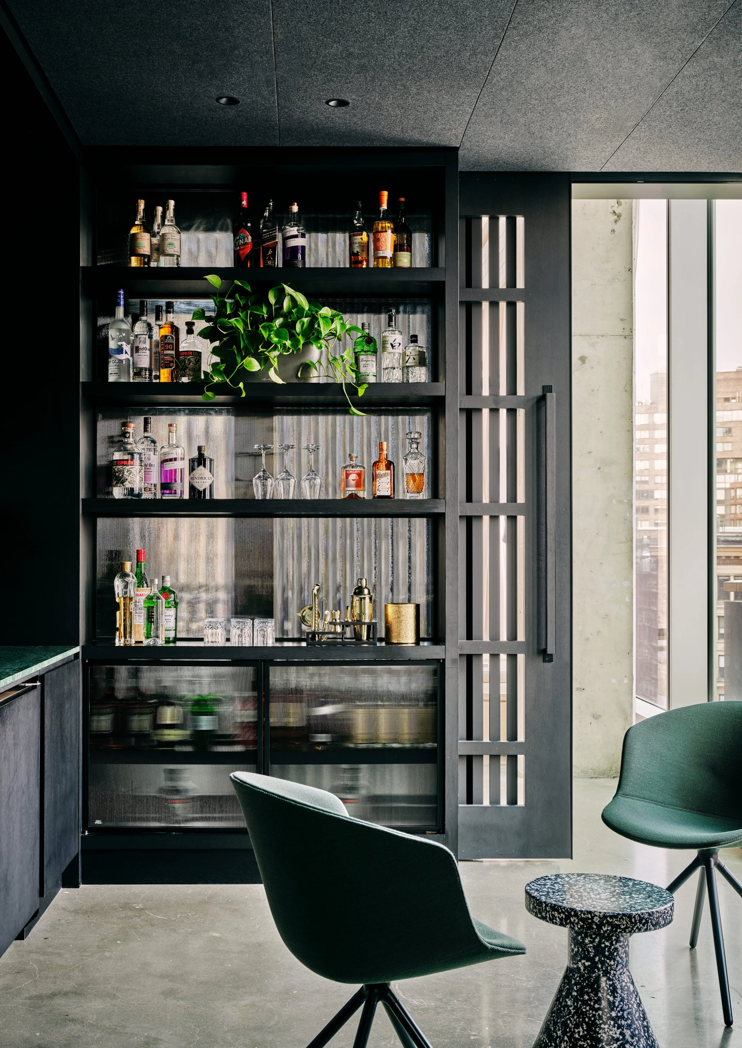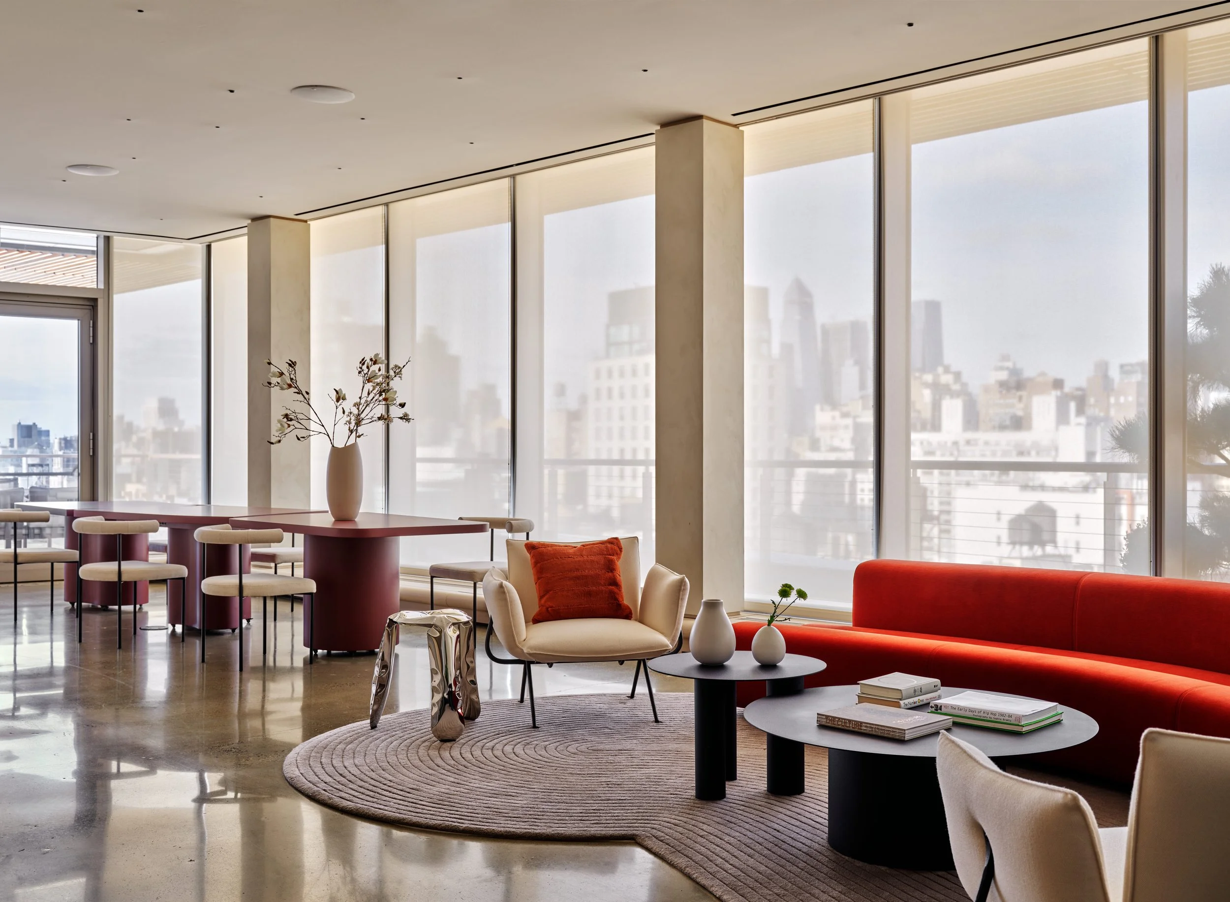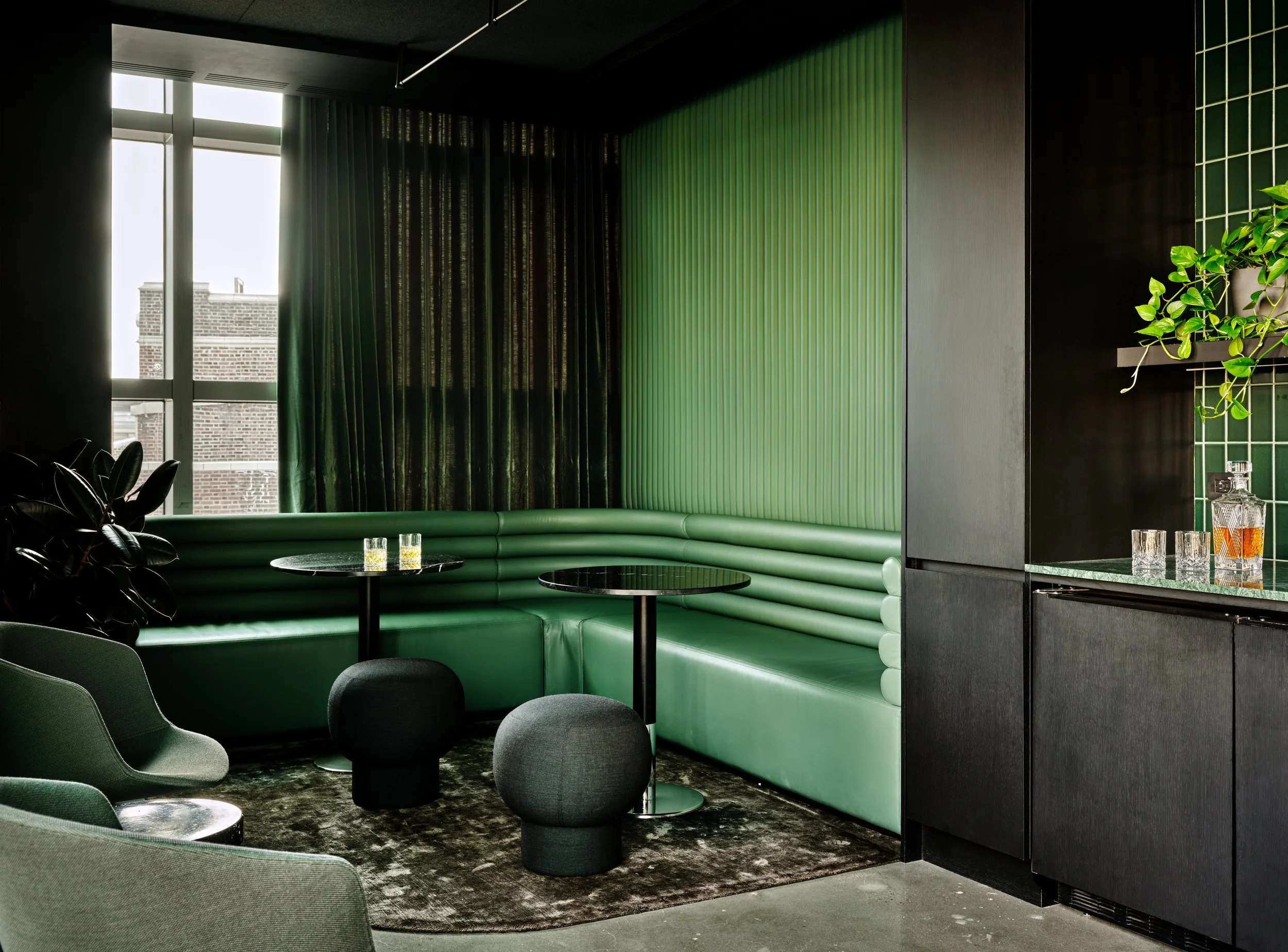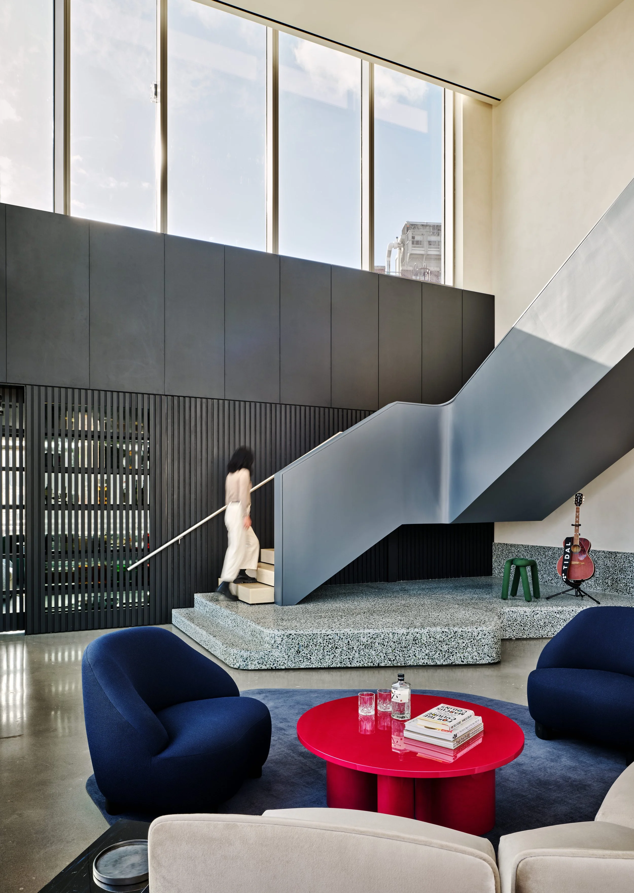 The Salon, teaming with warmth and light, welcomes into a lounge with a reception bar and doubles to host events or function as a workspace. Enveloped in a vibrant burgundy, the adjacent listening room is engineered with precision, inviting one into TIDAL’s world of high-fidelity sound. The Living Room, a double-height collaborative work lounge and pantry, is fitted for presentations and performances, with a stage seamlessly integrated and an adjacent speakeasy nook, walled in deep green. The Study, designed with wood accents, soft textures, and neutral tones, serves as a calm, focused work environment. Finally, The Studio is an intimate, yet lively, wing designed for connection among artists, brands, and creators. The design is music-centric and tech forward with punches of color to encourage a deep dive into the creative act.