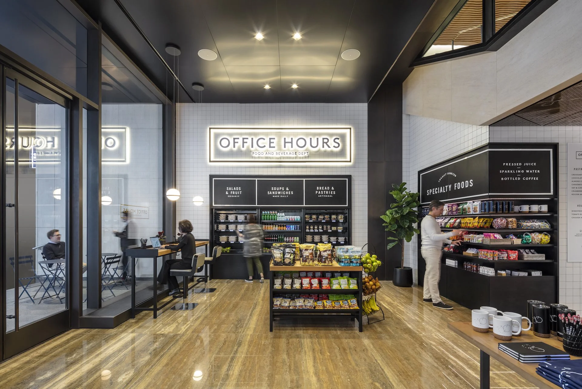 Rounding out the experience, we designed a full-service restaurant and bar (The Landing) and a gourmet grab and go offering (Office Hours), both operated by the award-winning hospitality group DMK. Warm and inviting, these food & beverage integrations are true multi-functional connectors for tenants, guests, and restaurant patrons.